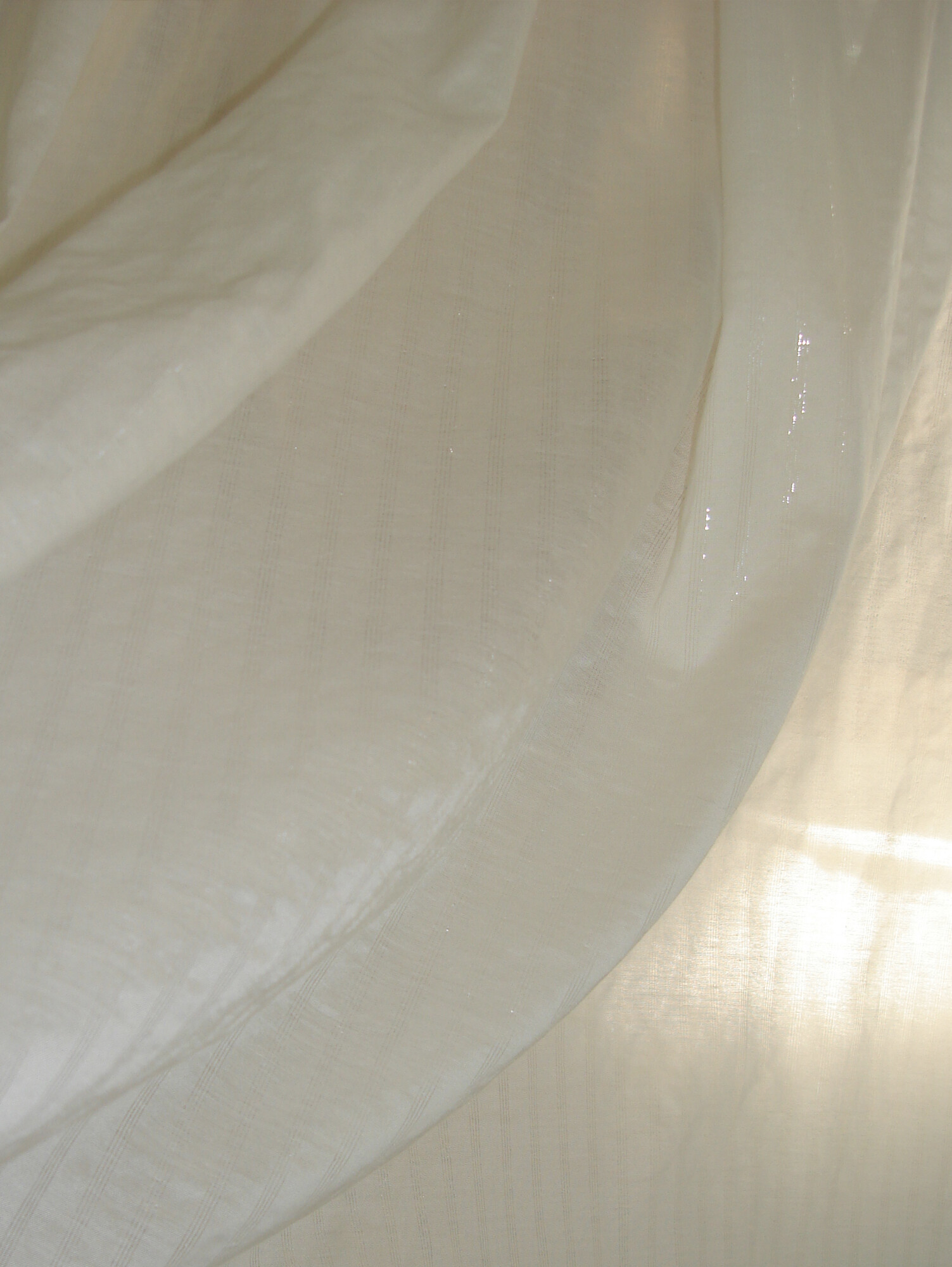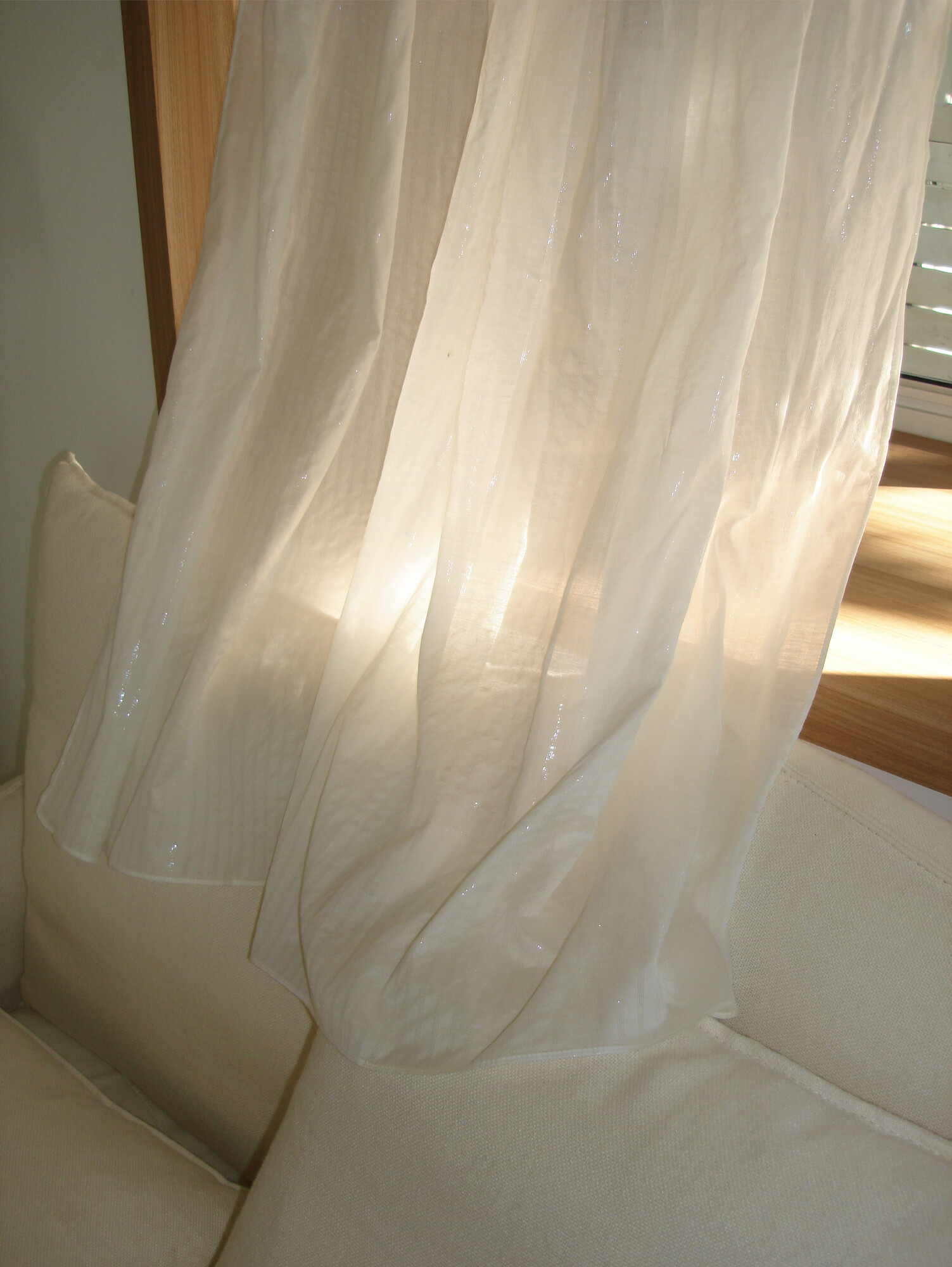 얇고 부드러운 흰색 원단 사이로 반짝이는 메탈사가 은은하게 빛을 받아 공간에 따뜻한 결을 더합니다.