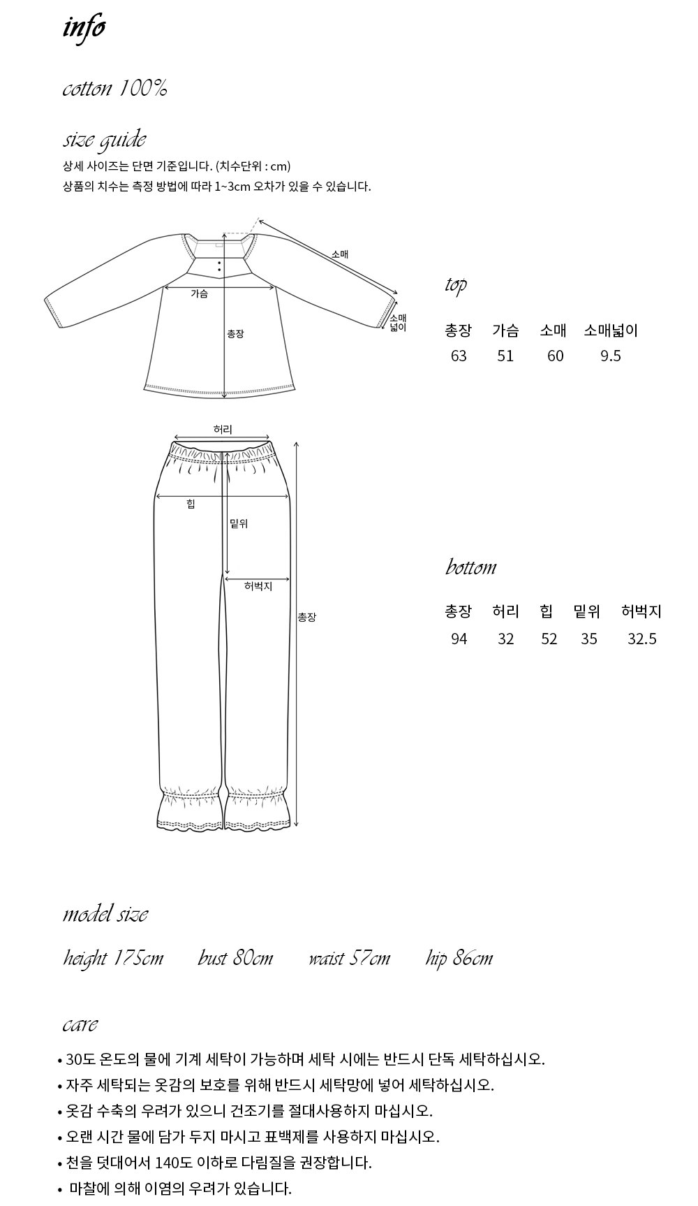 코지한 컬러감에 채도가 낮은 소매 배색이 포인트가 되는 파자마예요. 톡톡하고 보드라운 다이마루 원단으로 제작되어 정말 편안한 착용감과 터치감을 지닙니다. 잠옷을 입고 벗을 때에 편하게 착용될 수 있도록 넓은 스퀘어 네크라인으로 디자인 되었습니다. 소매를 올리고 세안을 하거나 화장실에서 바지단을 걷어야하는 경우에도 잠옷이 젖지 않도록 소매와 바지단에는 고무줄이 들어가있어요. 잠을 잘 때에는 고무줄이 조이지 않게끔 적당한 정도의 탄성을 테스트하여 불편함이 없도록 제작하였습니다. 150~170cm의 다양한 스펙에서도 너무 길거나 짧게 느껴지지 않도록 디자인하여 체형 구애없이 프리사이즈로 착용하기 좋은 아이템이에요. 편안하고 사랑스러운 잠옷을 입고 보내는 여러분의 아침과 밤이, 더욱 아늑하고 행복해지를 바라요-!