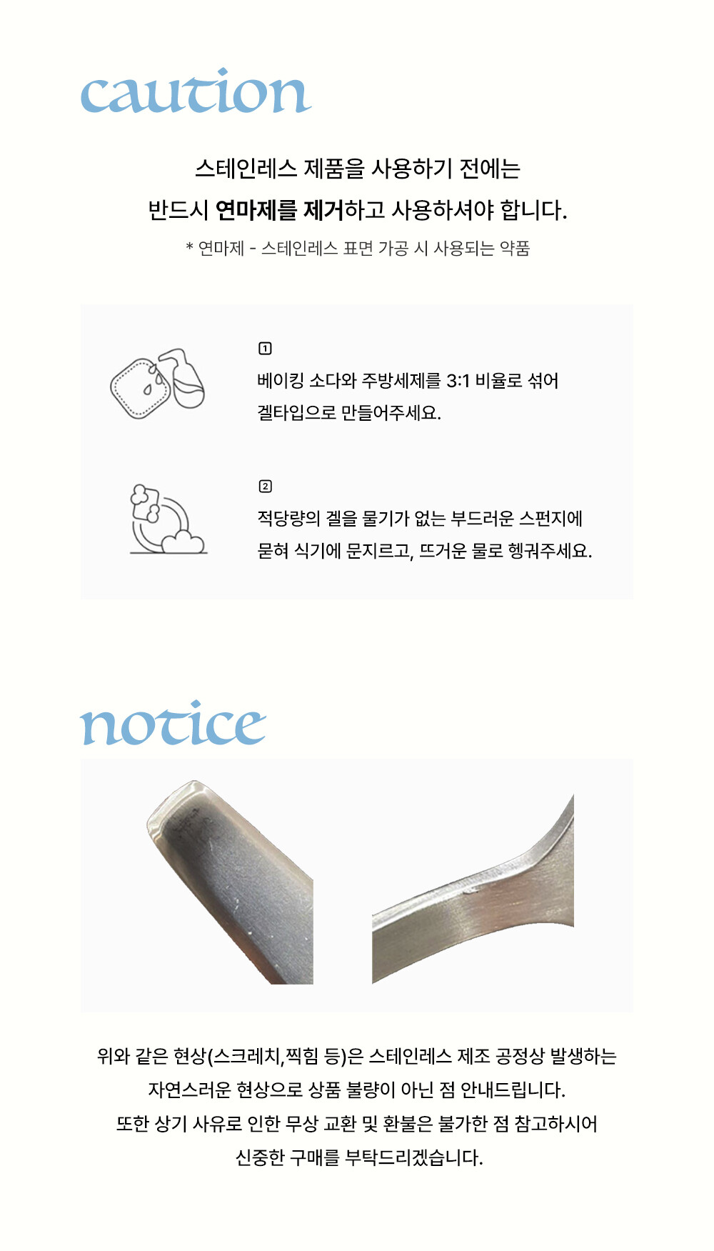 - 18-10 스테인리스(SUS 304)는 내식성(부식)과 내열성이 가장 강한 소재이며, 인체에 무해하고 열에 강하며 세척이 용이할 뿐 아니라 녹이 슬 걱정 없는 식기용으로 최고 등급 스테인리스입니다.