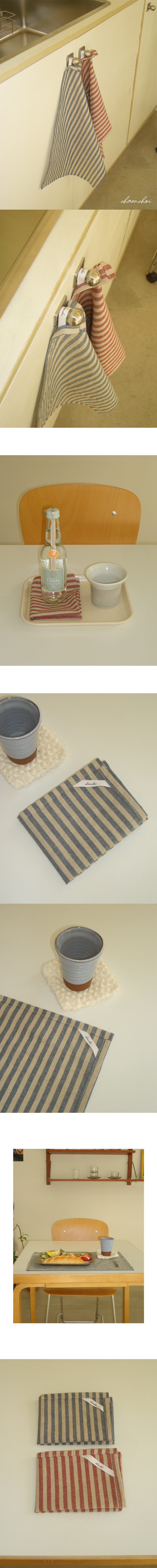린넨•면 혼방 소재의 빈티지한 스트라이프 키친 클로스입니다. 주방에서 요리를 하면 손을 닦을 일이 정말 많지요- 넉넉한 사이즈로 제작되어 물기를 닦는 용도로도, 테이블 매트의 용도로도 두루두루 사용하기 좋습니다.